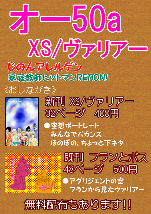 オフ Category:お知らせ Date:2014年08月02日 夏コミ(8/16)とグッコミ(8/31)、リボーンのヴァリアーで参加します。●夏コミ:8/16(土)「じのんアレルゲン」 東3 オ-50a 新刊あるといいな…サンプル等は無事入稿できたらリンク貼りにきます。しかし見事に西にばかり行きたいジャンルがあるな… [0回]
